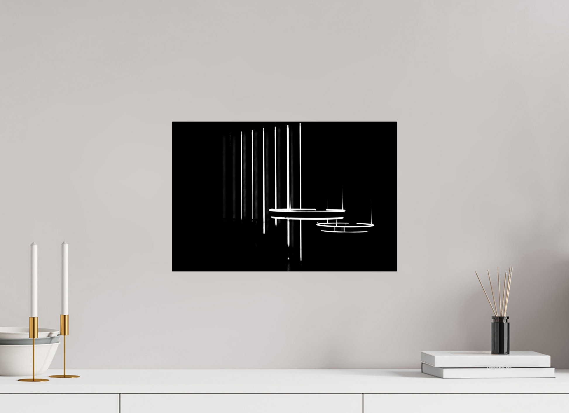 The thin vertical rings of light hover against a dark background creating a mysterious and futuristic feel.