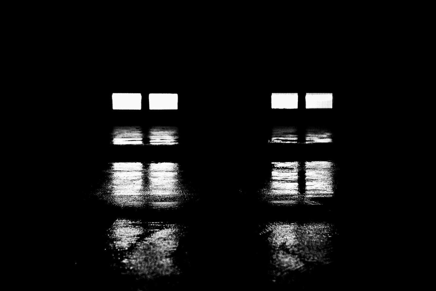 Two pairs of lights with their stacked reflections on the rainy tarmac surrounded by an otherwise pitch-black nothingness.
