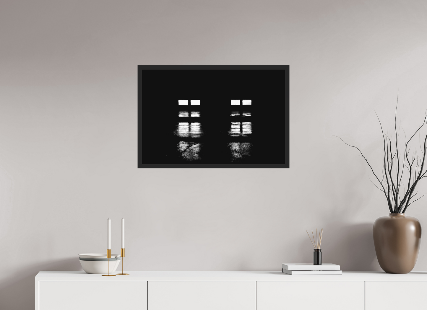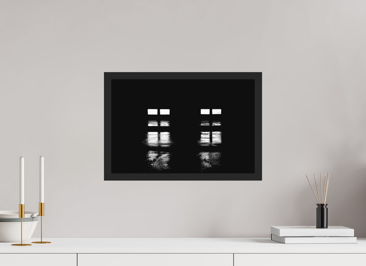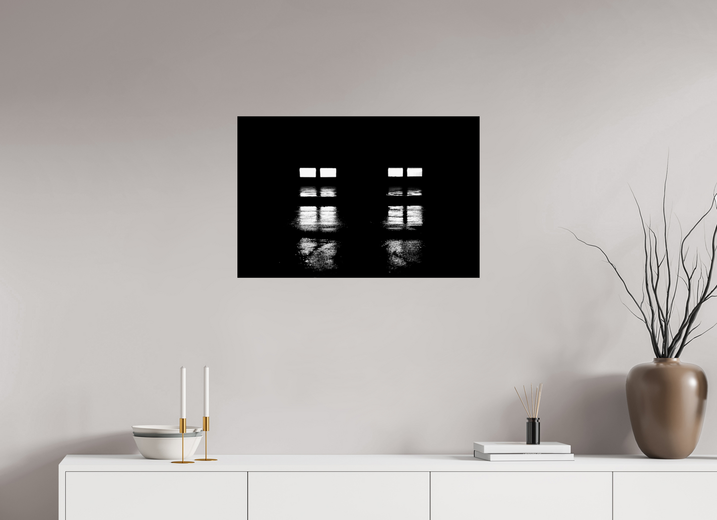 Two pairs of lights with their stacked reflections on the rainy tarmac surrounded by an otherwise pitch-black nothingness.