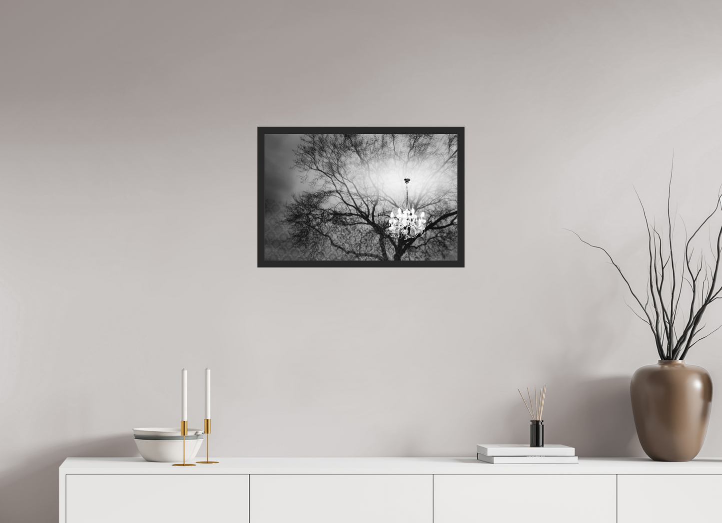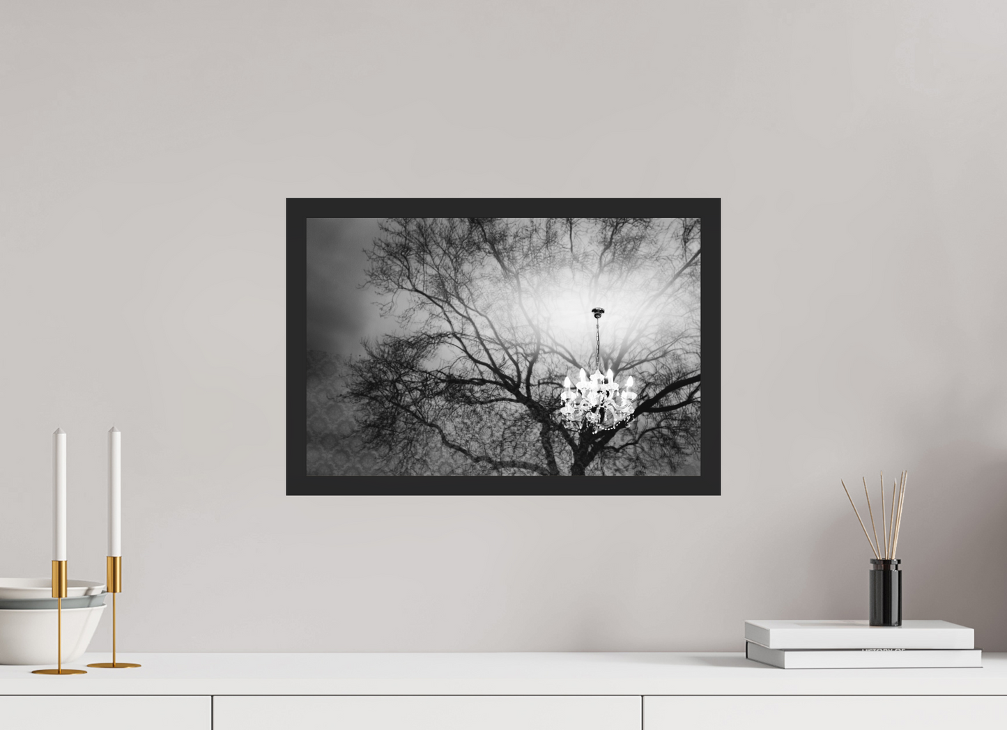 Chandelier through a shop window reflecting a tree, Heidelberg, Germany