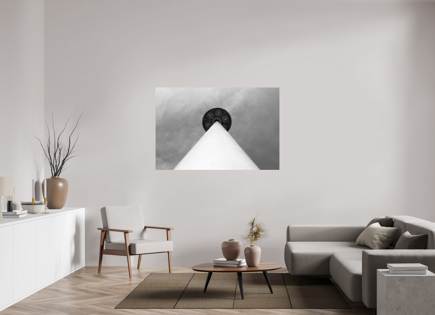 Dramatic perspective of a tall, slender street lamp that appears to reach into the cloudy sky.